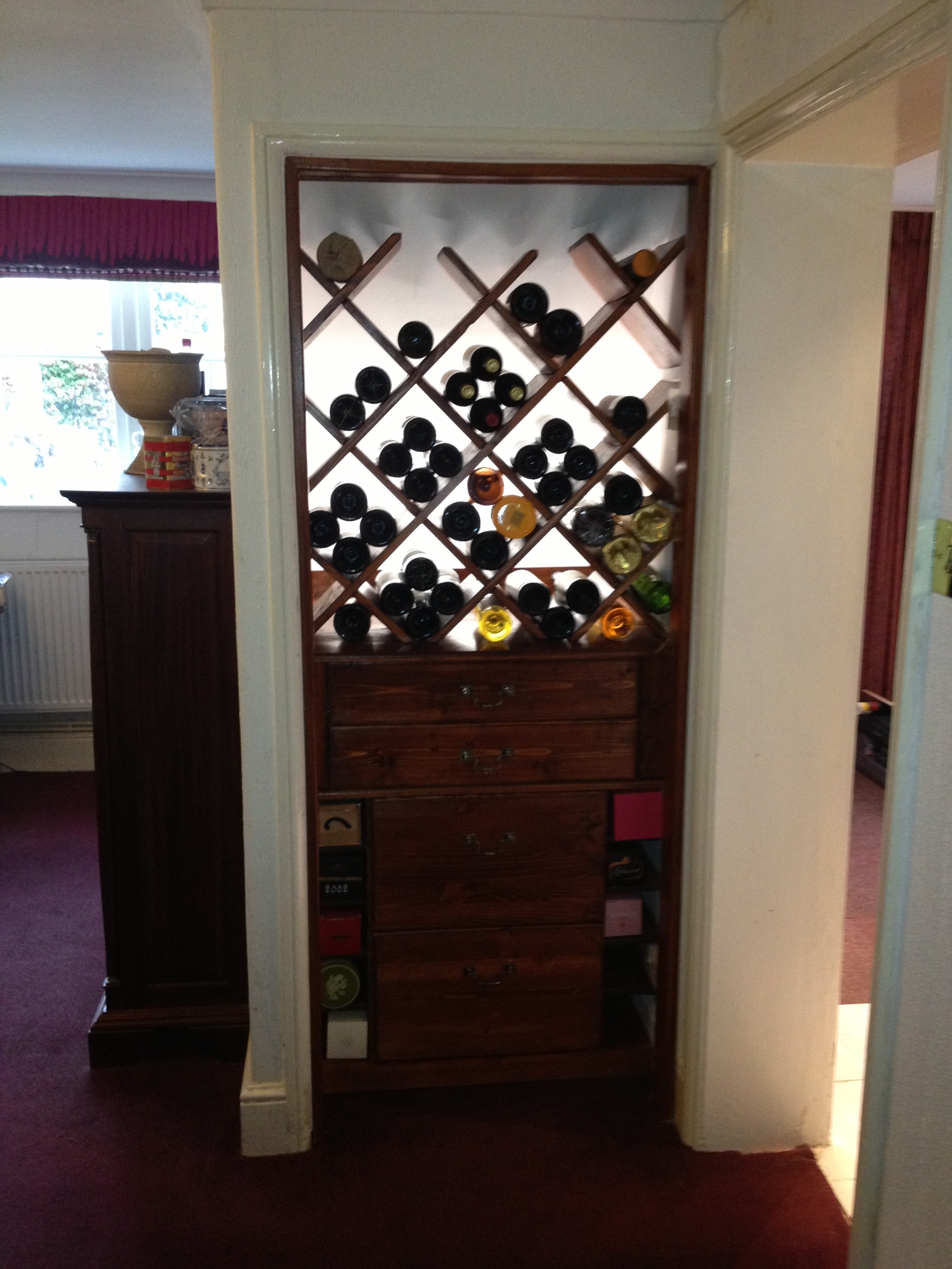 Custom built under stair wine rack and draws for additional bottles and mixer storage